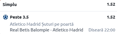 Real Betis - Atletico Madrid este meciul de închidere al etapei cu numărul 10 din La Liga. În rândurile de mai jos îți sunt prezentate informații despre cele două formații, cât și un pont în cotă 1.52!
