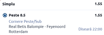 Mergem și pe Estadio de La Cartuja, acolo unde, începând cu ora 22:00, avem programată confruntarea dintre Real Betis - Feyenoord, meci din cadrul grupei de Europa League. Pontul meu este în cotă 1.55!