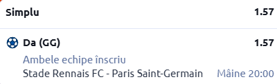Mergem și pe Roazhon Park, acolo unde Rennes urmează să primească vizita celor de la PSG, într-un meci ce contează pentru etapa cu numărul 22 din Ligue 1. Pontul meu este în cotă 1.57!