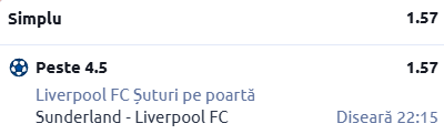 Am să merg destul de simplu la această partidă. Mizăm mai exact pe linia de peste 4,5 șuturi pe poartă trimise de Liverpool. Mi se pare cel mai potrivit pariu pentru acest joc.
