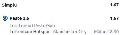 Mergem mai întâi pe Tottenham Hotspur Stadium, acolo unde Spurs urmează să primească vizita celor de la Manchester City. În rândurile de mai jos găsești informațiile necesare pentru acest duel, cât și un pont în cotă 1.67!