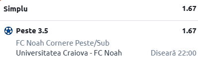 Pronostic: Peste 3,5 cornere FC Noah - Cota 1.67