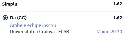 Ultima recomandare de astăzi vine din Cupa României, acolo unde, începând cu ora 20:30, avem programată întâlnirea dintre Universitatea Craiova - FCSB. Eu am să mă bazez destul de simplu, pe un pont în cotă 1.62!