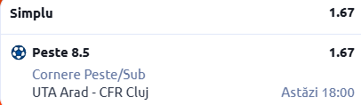 Mergem mai întâi în primul eșalon de fotbal românesc, acolo unde, începând cu ora 18:00, avem programată confruntarea dintre UTA Arad - CFR Cluj. Pontul meu este în cotă 1.67!