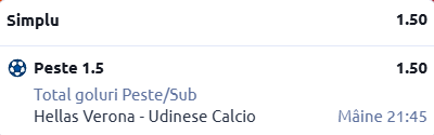 Mergem și pe Stadio Marc’Antonio Bentegodi, acolo unde Verona urmează să primească vizita celor de la Udinese. În rândurile de mai jos găsești informațiile necesare pentru acest duel, cât și un pont în cotă 1.50!