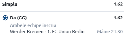 Werder Bremen și FC Union Berlin urmează să deschidă în această seară etapa cu numărul 8 din primul eșalon de fotbal german - Bundesliga. În rândurile de mai jos îți sunt prezentate detalii despre cele două formații, cât și un pont în cotă 1.62.