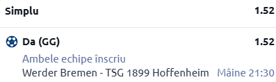 Facem o vizită și pe Weserstadion, acolo unde Bremen urmează să primească vizita celor de la Hoffenheim. În rândurile de mai jos găsești informații esențiale despre cele două grupări, cât și un pont în cotă 1.52!