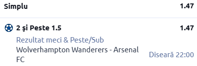 Facem mai întâi o vizită pe Molineux Stadium, acolo unde Wolves urmează să primească vizita celor de la Arsenal. În rândurile de mai jos îți sunt prezentate detalii despre cele două formații, cât și un pont în cotă 1.47!